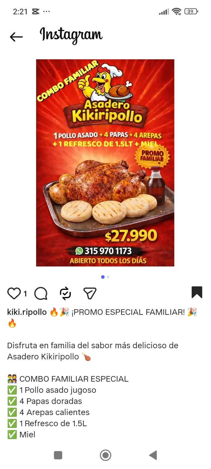 Pollo asado+ 4 papas+4 arepas+miel + 1 gaseosa 1.5L Por solo $ 27.990